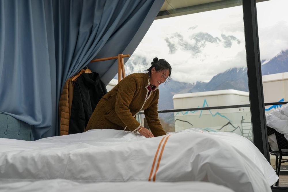 2025年4月4日,林芝索松村一家民宿的服務員在整理房間。近年來,林芝在生態(tài)保護與旅游發(fā)展的良性互動中,探索出“賞花+民宿”“賞花+文創(chuàng)”等復合經(jīng)營模式。2025年4月4日至4月6日期間,林芝市累計接待游客20.86萬人次,同比增長20.58%;實現(xiàn)旅游收入1.5億元,同比增長37.62%。