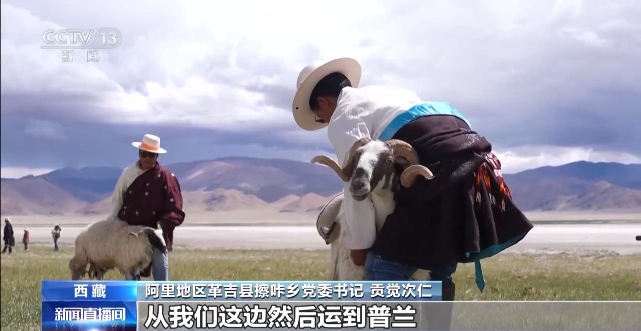 阿里地區(qū)革吉縣擦咔鄉(xiāng)黨委書(shū)記 貢覺(jué)次仁:歷史時(shí)期,我們這邊采鹽的湖稱作章倉(cāng)三湖。鹽以綿羊作為交通工具,每只綿羊大概背20斤左右,從我們這邊運(yùn)到普蘭、日喀則,到印度、尼泊爾等地,以物易物的方式進(jìn)行交易。