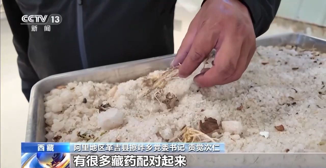 阿里地區(qū)革吉縣擦咔鄉(xiāng)黨委書(shū)記 貢覺(jué)次仁:這個(gè)就是足療鹽的原料,除了鹽以外還有很多藏藥,將原料先做初步的粉碎,然后進(jìn)行混合,最后磨成跟面粉一樣。