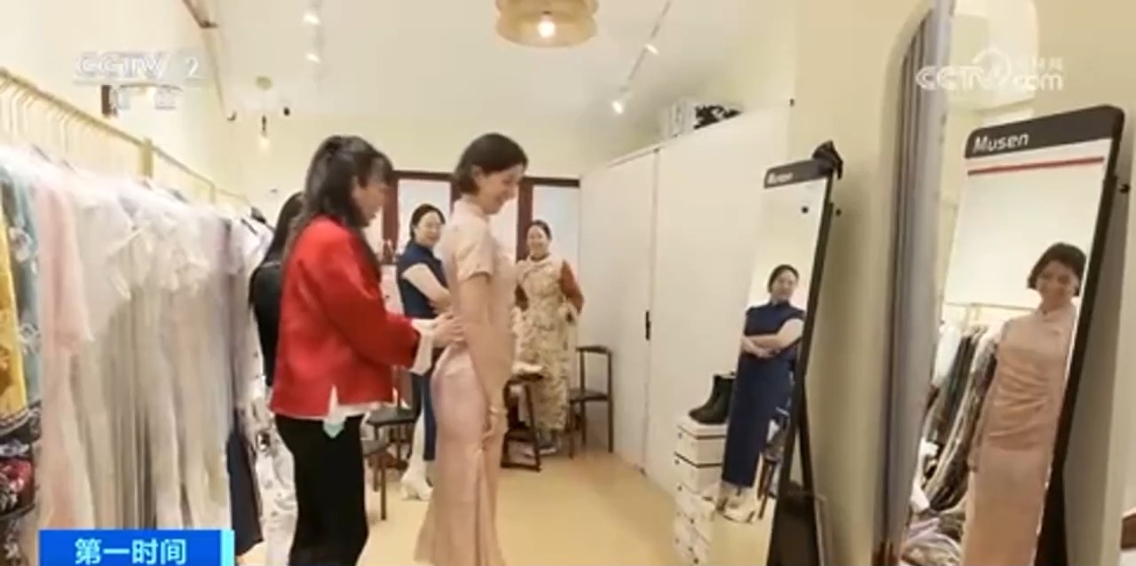 旗袍店店長表示,最近幾個月由于外國游客增多,許多外國客人來體驗穿中國旗袍,也帶動了門店銷量增長。