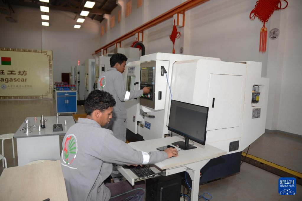 2月10日,在馬達加斯加首都塔那那利佛的魯班工坊,機械工程專業(yè)學生進行數(shù)控機床的教學實踐。新華社發(fā)(西塔卡·拉喬納里松攝)