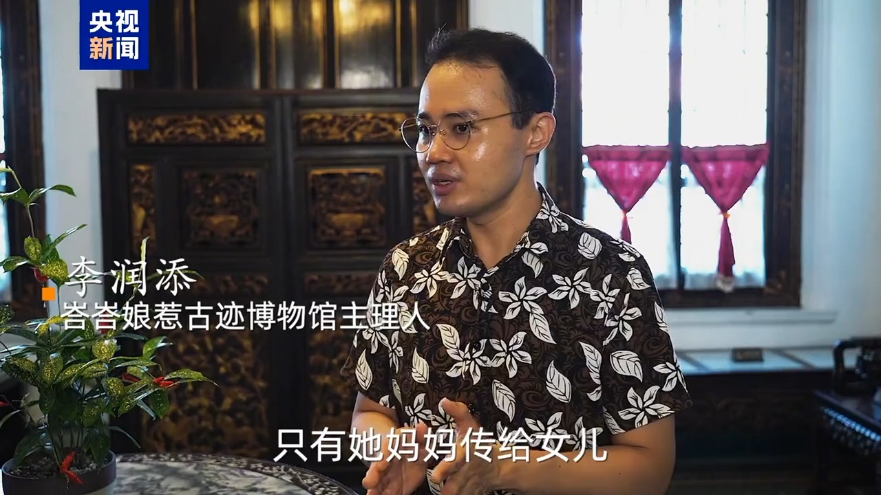 峇峇娘惹古跡博物館主理人 李潤添:所謂的娘惹文化其實是中華文化、馬來文化以及西方文化的融合。眼看好像是從西方來的椅子,但是你仔細觀察,它的手扶那邊有龍頭,里邊還含著一粒珠。
