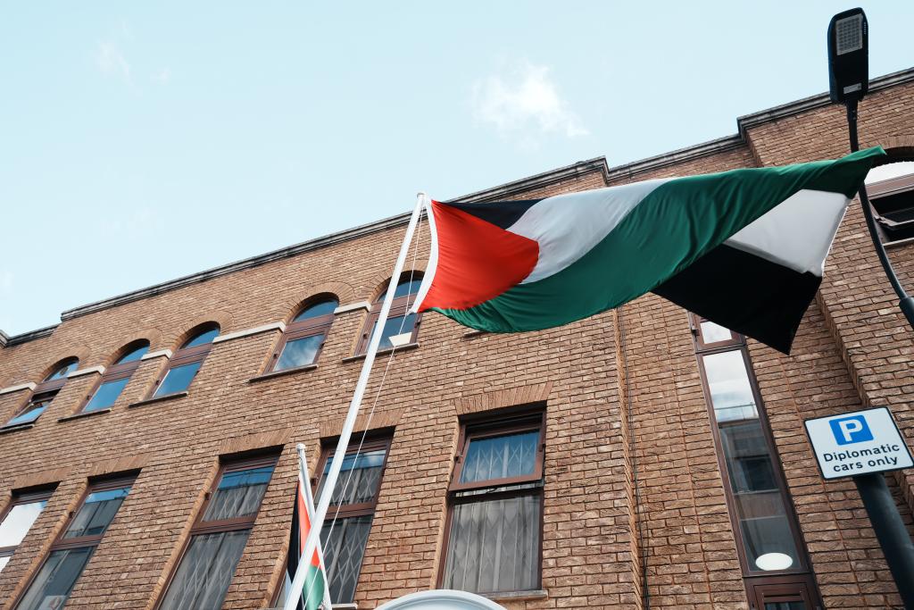 9月22日,巴勒斯坦駐英國代表處在其倫敦辦公區(qū)外升起巴勒斯坦國國旗。新華社記者 趙家淞 攝