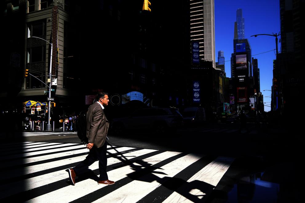 10月1日,在美國紐約曼哈頓的時報廣場附近,行人通過人行橫道斑馬線過馬路。新華社記者吳曉凌攝