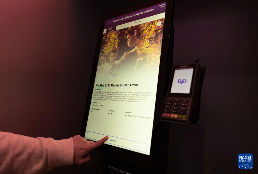 9月25日,在墨西哥首都墨西哥城的一家電影院,觀眾在自動(dòng)售票機(jī)上購(gòu)買《哪吒2》電影票。新華社記者 李夢(mèng)馨 攝