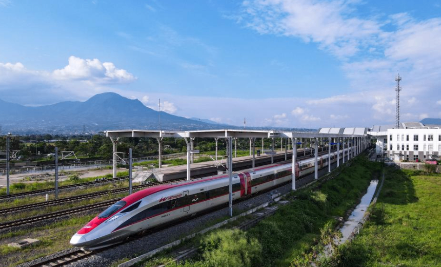 5月20日,在印度尼西亞萬隆,一列雅萬高鐵高速動(dòng)車組列車駛出德卡魯爾站(無人機(jī)照片)。新華社記者 徐欽 攝