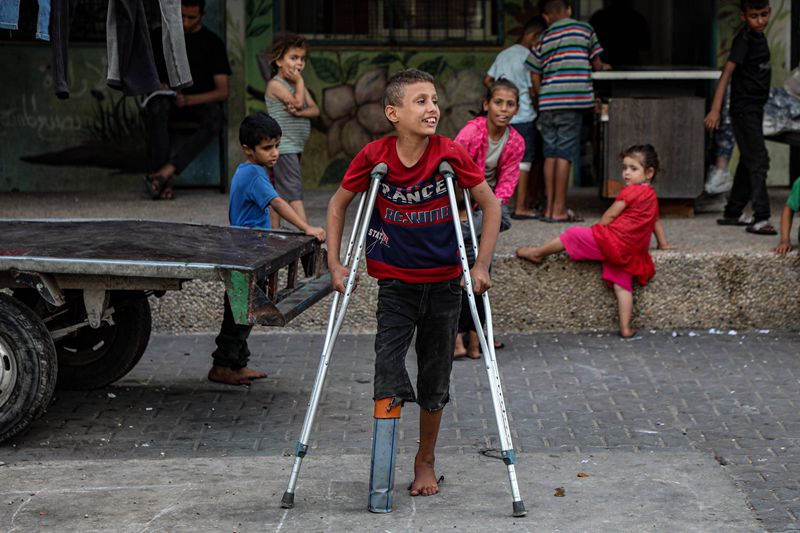 10月5日,年僅10歲的少年拉提卜·阿布·卡里克在加沙地帶中部代爾拜拉赫附近的聯(lián)合國臨時安置機(jī)構(gòu)內(nèi)拄著拐杖行走。在數(shù)月前的一次以色列空襲中,拉提卜失去了右腿致殘,他的母親和兄弟也在襲擊中身亡。 新華社發(fā)(里澤克·阿卜杜勒賈瓦德攝)