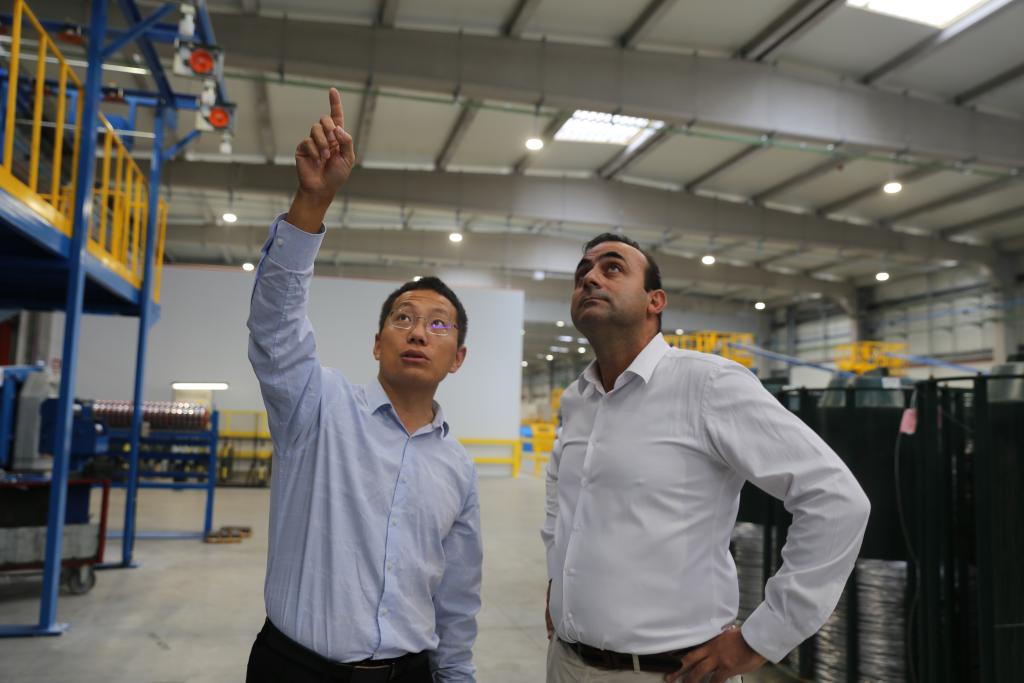 10月3日,在葡萄牙北部奧瓦爾市,亨通集團(tuán)駐葡萄牙的設(shè)備經(jīng)理劉建龍(左)與阿爾科夫雷電纜廠首席運(yùn)營(yíng)官卡洛斯·格蘭雅討論技術(shù)問題。新華社記者荀偉攝