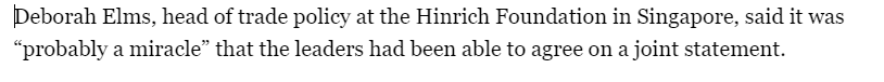 半島電視臺(tái)也關(guān)注了此次峰會(huì),報(bào)道援引新加坡欣里奇基金會(huì)貿(mào)易政策負(fù)責(zé)人黛博拉 埃爾姆斯的話說,各成員領(lǐng)導(dǎo)人能夠就聯(lián)合聲明達(dá)成一致是“了不起的事情”。他說,鑒于亞太經(jīng)合組織經(jīng)濟(jì)體的不同立場(chǎng),要將任何達(dá)成一致的措辭寫入文件都是一項(xiàng)“充滿挑戰(zhàn)的工作”。