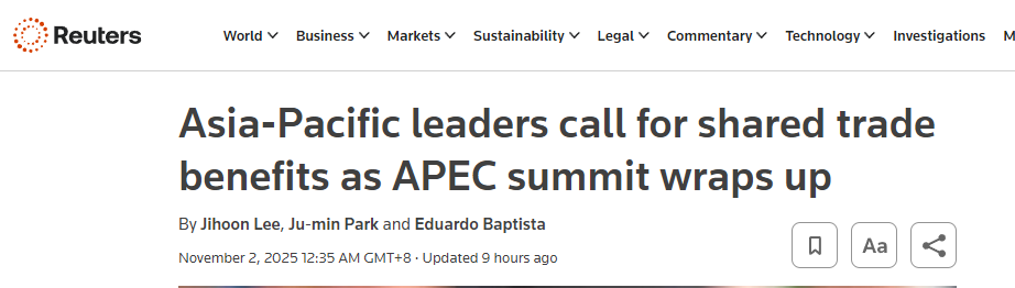 2025年亞太經(jīng)合組織(APEC)領(lǐng)導(dǎo)人非正式會(huì)議于10月31日至11月1日在韓國慶州舉行,會(huì)議發(fā)表了《慶州宣言》。多家外媒報(bào)道稱,會(huì)議凸顯了亞太地區(qū)經(jīng)濟(jì)體對(duì)自由貿(mào)易的承諾。