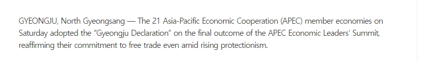 韓國《中央日?qǐng)?bào)》報(bào)道稱,《慶州宣言》反映出此次APEC領(lǐng)導(dǎo)人峰會(huì)的最終成果,并重申了在保護(hù)主義抬頭 的背景下,各成員領(lǐng)導(dǎo)人對(duì)自由貿(mào)易的承諾。