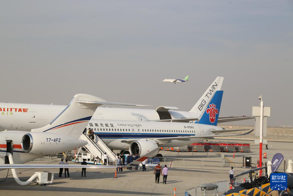 11月17日,在阿聯(lián)酋迪拜,中國商飛的C919飛機進行飛行展示,地面上停著的是中國南航的C919飛機。新華社記者 溫新年 攝