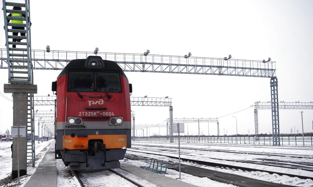 2025年12月6日,一輛即將開往中國的俄羅斯貨運列車??吭诙砹_斯下列寧斯闊耶鐵路口岸。新華社記者劉愷攝
