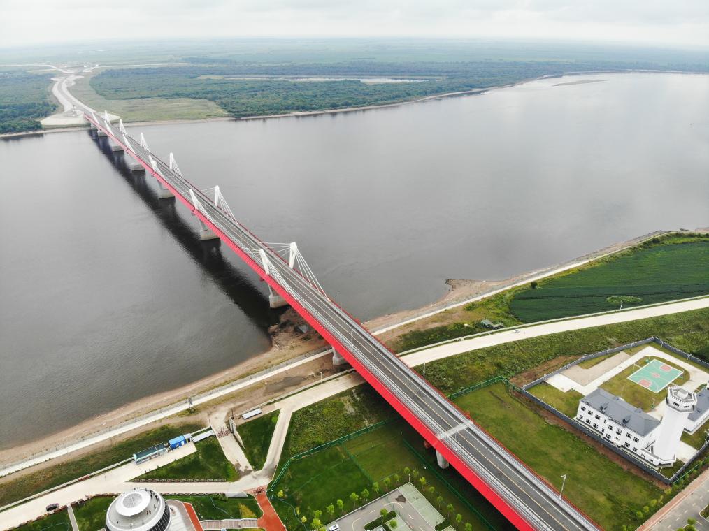 這是2023年8月11日在中國黑河一側拍攝的黑河-布拉戈維申斯克公路橋(無人機照片)。新華社記者王松攝