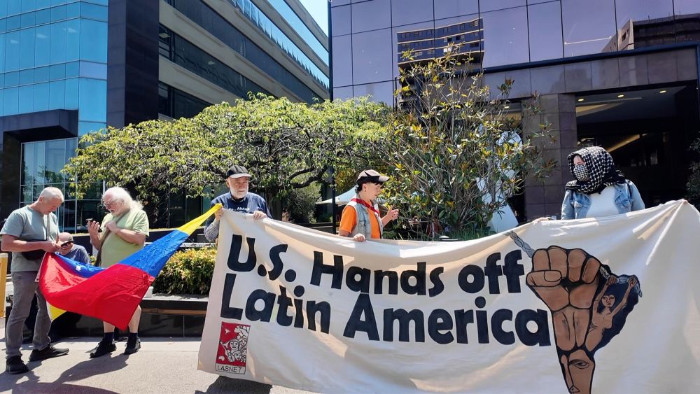 1月12日,澳大利亞墨爾本民眾在美國(guó)駐墨爾本總領(lǐng)事館門口舉行抗議活動(dòng)。抗議者手持委內(nèi)瑞拉國(guó)旗以及寫(xiě)有“美國(guó)停止干涉委內(nèi)瑞拉”字樣的旗幟,反對(duì)美國(guó)對(duì)委內(nèi)瑞拉的軍事行動(dòng)。
