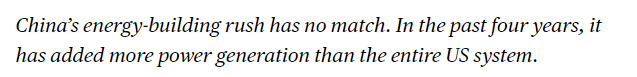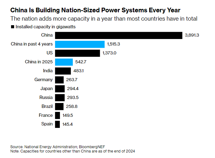 文章援引中國國家能源局日前公布的數(shù)據(jù),2025年,中國各類技術(shù)新增發(fā)電裝機(jī)容量達(dá)到543吉瓦(GW)。這一數(shù)字比截至2024年底印度全國所有發(fā)電廠的總?cè)萘窟€要高出12%。自2021年底以來,中國新增的發(fā)電容量也已超過整個美國電力系統(tǒng)的總量。
