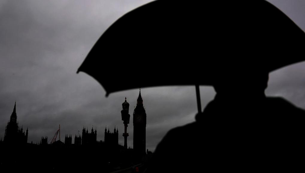 1月27日,一名男子撐傘走在英國倫敦大本鐘附近。新華社記者李穎攝
