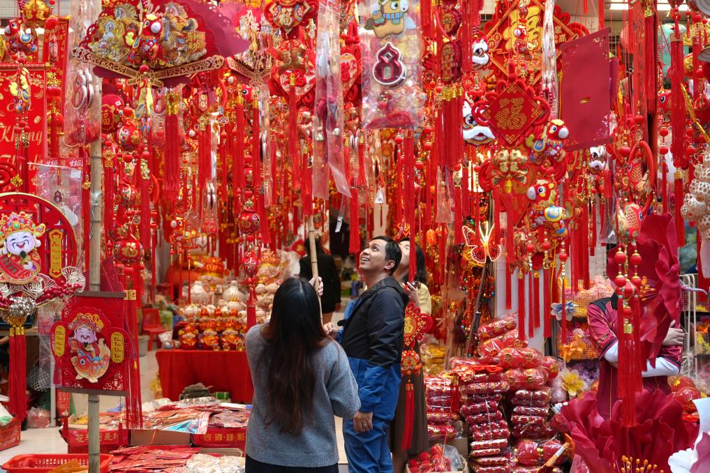 2月13日,顧客在越南首都河內的馬市街選購新春飾品。新華社記者 劉潁 攝