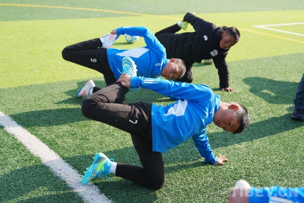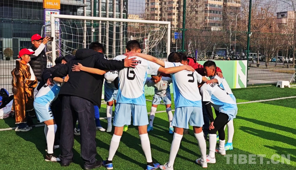 盡管正值寒冬,西藏的足球少年們已經(jīng)迫不及待地換上球服開始跑動熱身。帶隊教練和球員們圍成圓圈,團抱在一起,大喊加油!
