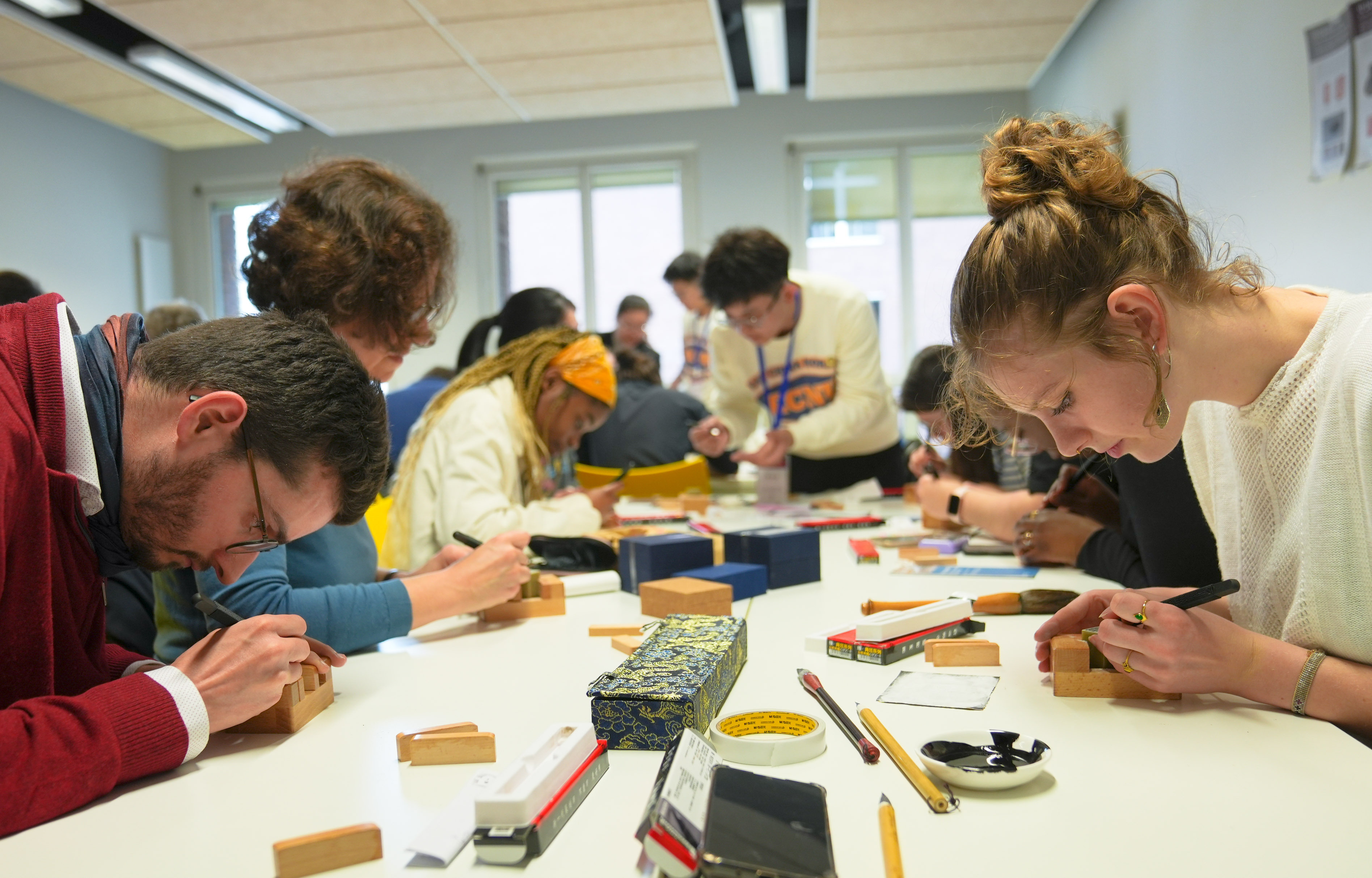 當地時間5月2日,在巴黎東方語言文化學院內,華東師大美術學院崔樹強教授與教育部中華優(yōu)秀傳統文化篆刻傳承基地主任張索教授、顧琴教授帶領書法篆刻碩士研究生杜家航、程羽瑄、蔡崢指導巴黎東方語言文化學院師生進行書印體驗。