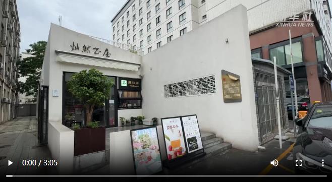 雅致的白色二層小樓,一層是書(shū)屋,二層是露臺(tái)。一面鏤空幕墻半圍起一個(gè)小巧庭院,“春茶到了”的招牌與蔥蘢繁花相映成趣。