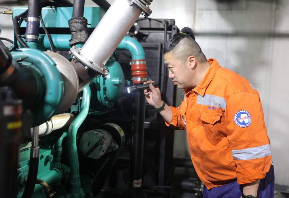 作為發(fā)電班班長,張冬的主要職責是確保柴油發(fā)電機組正常運轉,為考察站輸送穩(wěn)定持續(xù)的電力?!鞍l(fā)電棟24小時需要有人值守,我們三個人兩班倒,每個班次12小時。”張冬說,“值班時每兩小時巡查一次,檢查發(fā)電機組是否有安全隱患。”