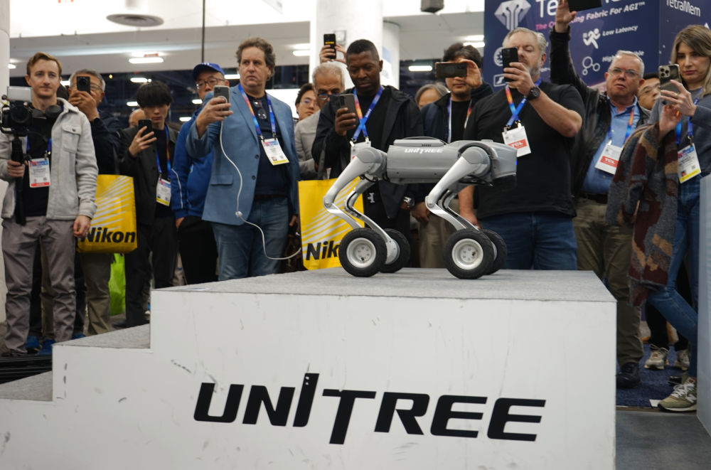 1月8日,在美國拉斯維加斯,人們?cè)谥袊髽I(yè)宇樹科技的展區(qū)觀看機(jī)器狗展示。新華社發(fā)(曾慧攝)