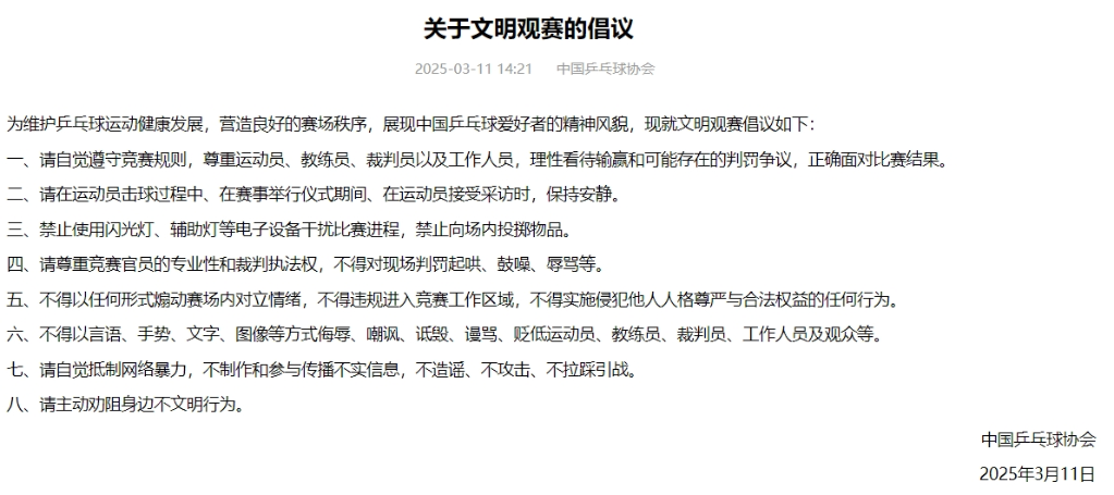 中國(guó)乒乓球協(xié)會(huì)11日在官網(wǎng)發(fā)布《關(guān)于文明觀賽的倡議》,其中提到理性看待輸贏、抵制網(wǎng)絡(luò)暴力等八項(xiàng)內(nèi)容。