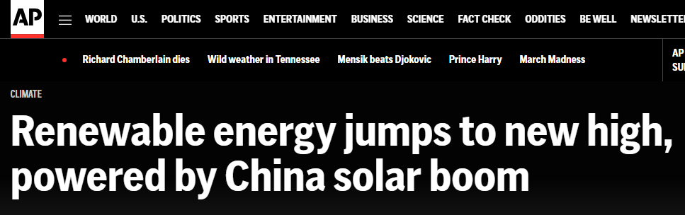 報道稱,中國太陽能熱潮推動了全球可再生能源發(fā)展。數(shù)據(jù)顯示,2024年,中國可再生能源發(fā)電新增裝機約3.74億千瓦,其中四分之三來自太陽能發(fā)電。