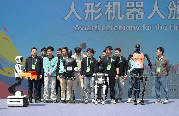 2025年4月19日,一臺(tái)機(jī)器人在人形機(jī)器人頒獎(jiǎng)儀式上托舉著獎(jiǎng)牌走向獲獎(jiǎng)機(jī)器人選手和技術(shù)團(tuán)隊(duì)。當(dāng)日,2025北京亦莊半程馬拉松暨人形機(jī)器人半程馬拉松舉行。新華社記者 李賀 攝