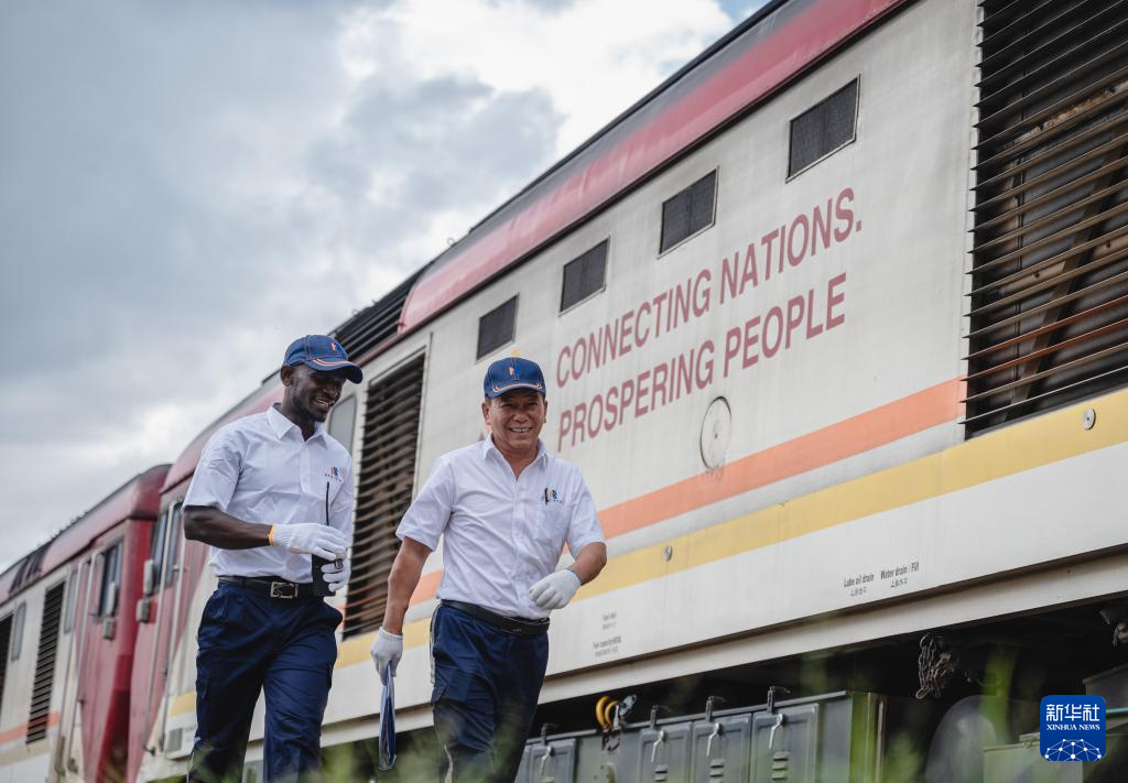 2023年5月23日,在肯尼亞內(nèi)羅畢,非洲之星鐵路運營公司機輛部的火車駕駛員蔣立平(右)與學(xué)員霍勒斯從一輛印有“連接國家 走向繁榮”標(biāo)語的蒙內(nèi)鐵路機車旁走過。 新華社記者 王冠森 攝