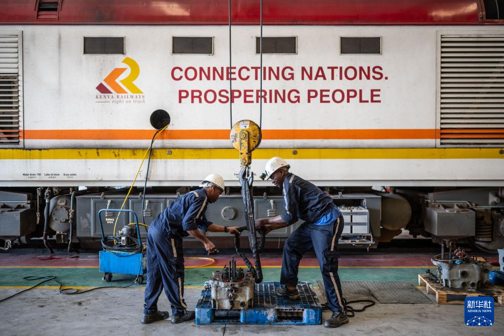 2025年1月23日,在肯尼亞內(nèi)羅畢蒙內(nèi)鐵路車間,維保人員在一輛印有“連接國家 走向繁榮”標(biāo)語的蒙內(nèi)鐵路機車前檢修配件。 新華社記者 王冠森 攝