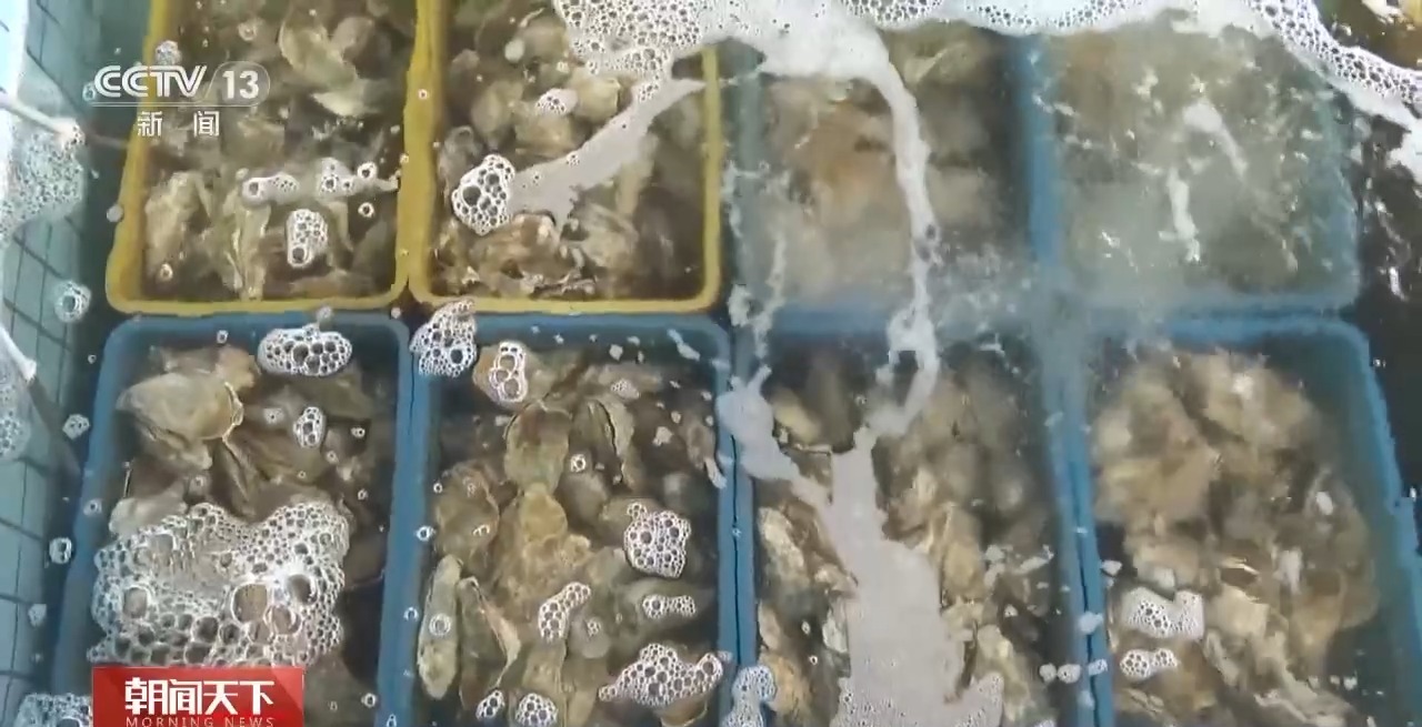 總臺央視記者 李嘯虎:在國家農(nóng)業(yè)產(chǎn)業(yè)強鎮(zhèn)廣東陽西程村鎮(zhèn),“五一”期間,這里的生蠔迎來大量上市。這片占地六萬多畝的生蠔養(yǎng)殖基地里,養(yǎng)殖戶正從水下收獲一排排成熟的生蠔,40多萬箱新捕撈的海鮮正從這里走上百姓的節(jié)日餐桌。