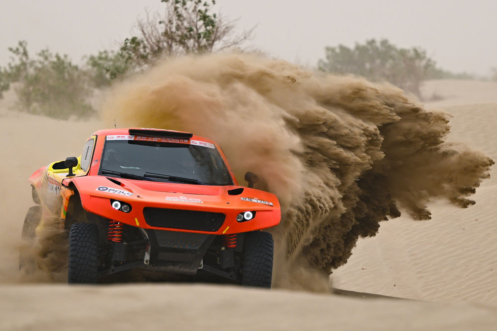 2025年5月28日,明源實(shí)業(yè)·承德雷鋒CR7車(chē)隊(duì)車(chē)手孫昊、領(lǐng)航員王東東在比賽中。當(dāng)日,2025中國(guó)環(huán)塔國(guó)際拉力賽第八賽段在新疆喀什地區(qū)葉城縣進(jìn)行。新華社記者 辛悅衛(wèi) 攝