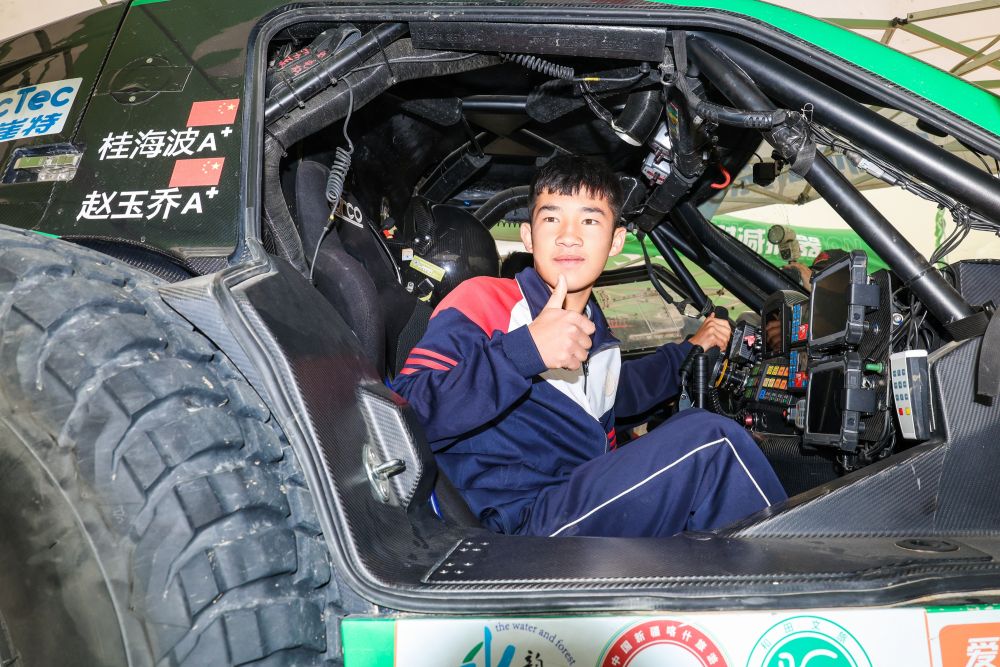 2025年5月31日,新疆喀什地區(qū)麥蓋提縣的中學(xué)生在環(huán)塔營(yíng)地參觀時(shí)與賽車(chē)合影。新華社發(fā)(環(huán)塔組委會(huì)供圖)