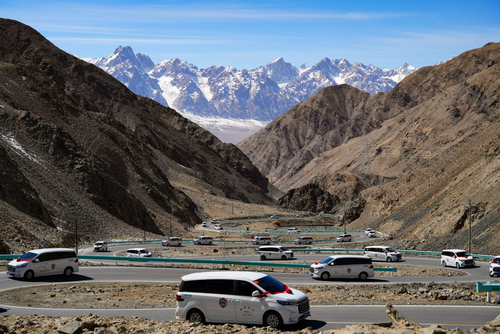 在新疆塔什庫(kù)爾干塔吉克自治縣,參加“盤(pán)龍古道”恢復(fù)通車(chē)儀式的車(chē)隊(duì)在行進(jìn)中(2025年3月22日攝)。新華社記者 徐宏巖 攝