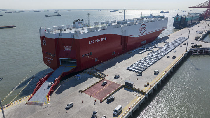 2025年4月26日,出口汽車在蘇州港太倉港區(qū)碼頭集中裝載上“深圳號”汽車運輸船(無人機照片)。新華社發(fā)(王須中 攝)