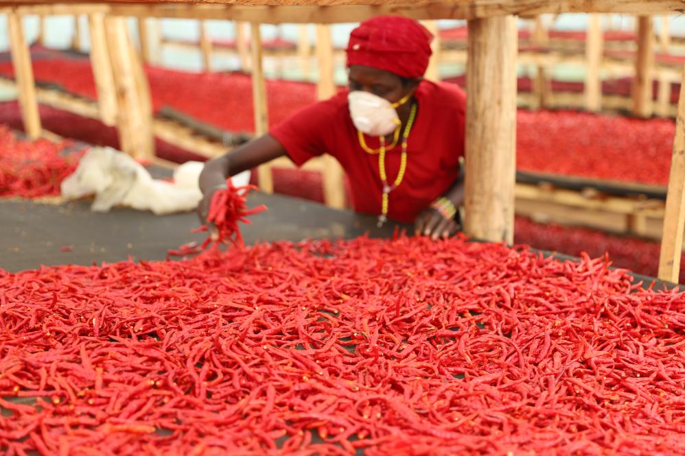 5月22日,工人在盧旺達東方省恩亞加塔雷地區(qū)篩選辣椒。新華社記者吉莉攝