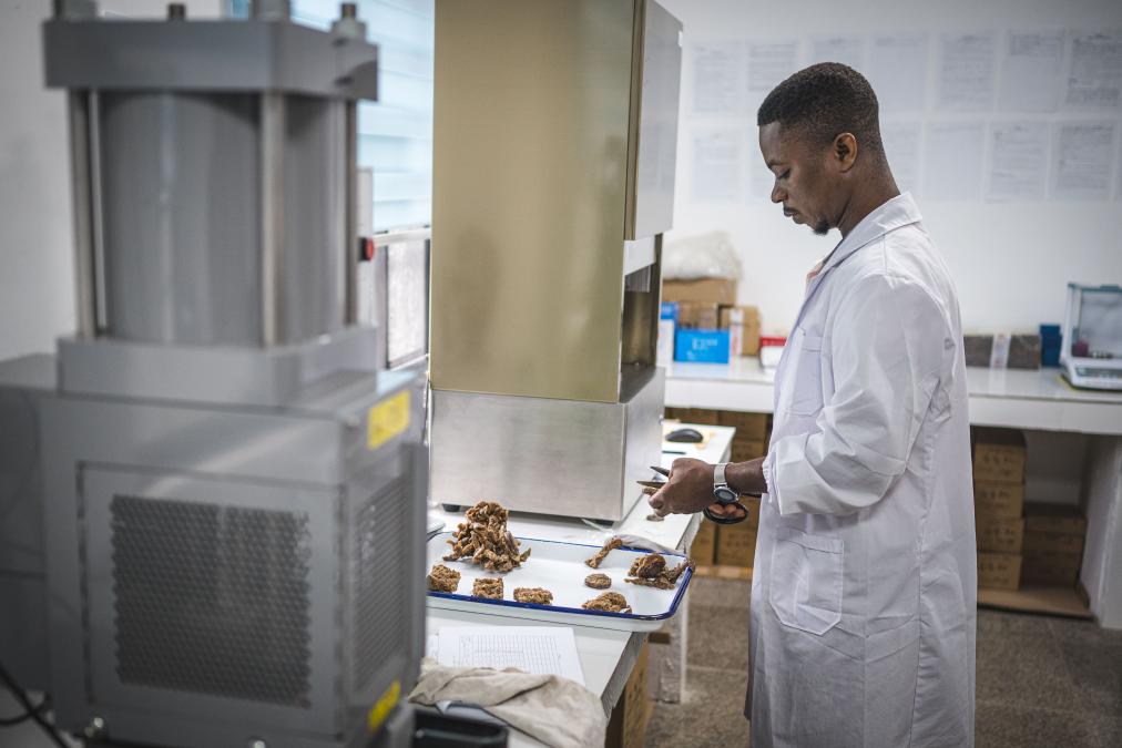 5月30日,在科特迪瓦圣佩德羅省大貝雷比鎮(zhèn),美蘭集團橡膠加工廠的技術(shù)人員對橡膠進行質(zhì)量測試。新華社記者王冠森攝