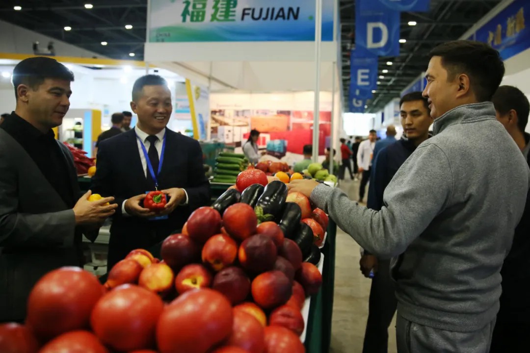 當(dāng)?shù)貢r間2024年8月23日,第十九屆哈薩克斯坦—中國商品展覽會在哈薩克斯坦首都阿斯塔納世博園國際展覽中心開幕。圖為來自中國的精品果蔬吸引不少觀眾前來問詢。 中新社記者 單璐 攝