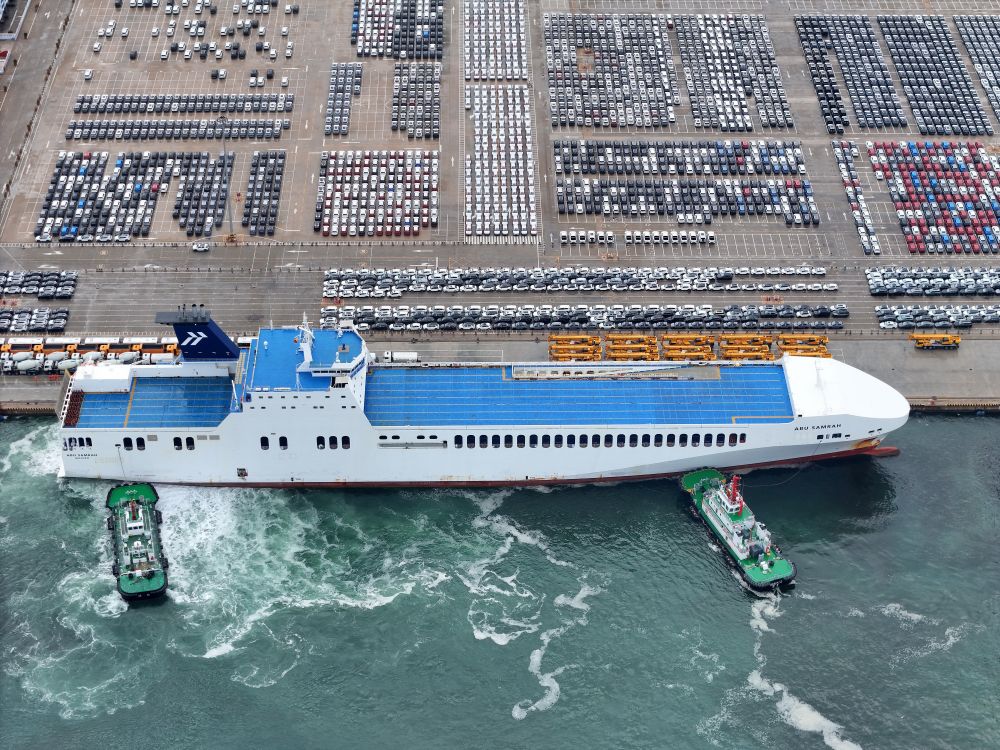 6月29日,汽車運(yùn)輸船停靠山東港口煙臺(tái)港,準(zhǔn)備裝運(yùn)出口汽車(無(wú)人機(jī)照片)。新華社發(fā)(唐克 攝)