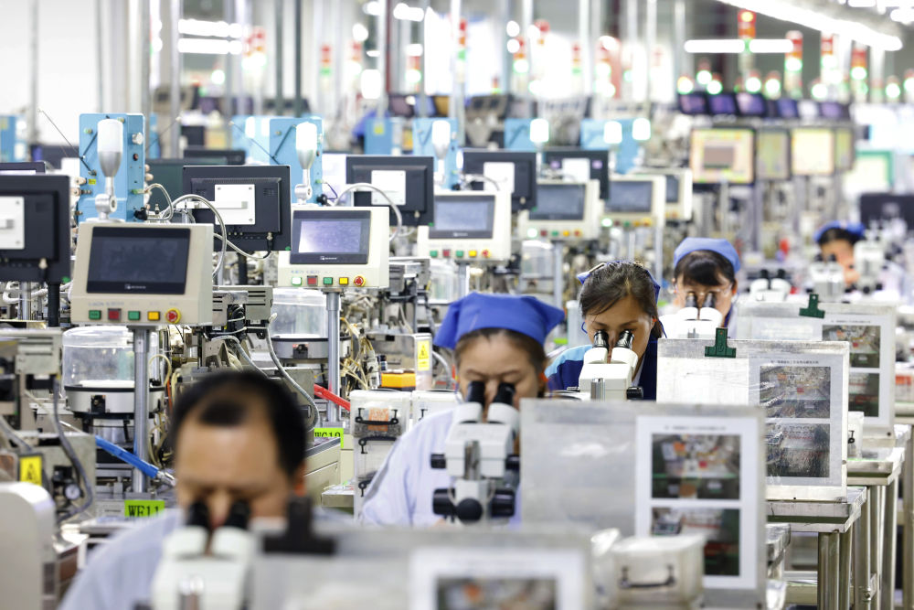 6月24日,在江蘇宿遷泗洪經(jīng)濟(jì)開(kāi)發(fā)區(qū)慶邦電子元器件(泗洪)有限公司車間內(nèi),工人加緊趕制出口的電子訂單產(chǎn)品。新華社發(fā)(許昌亮攝)