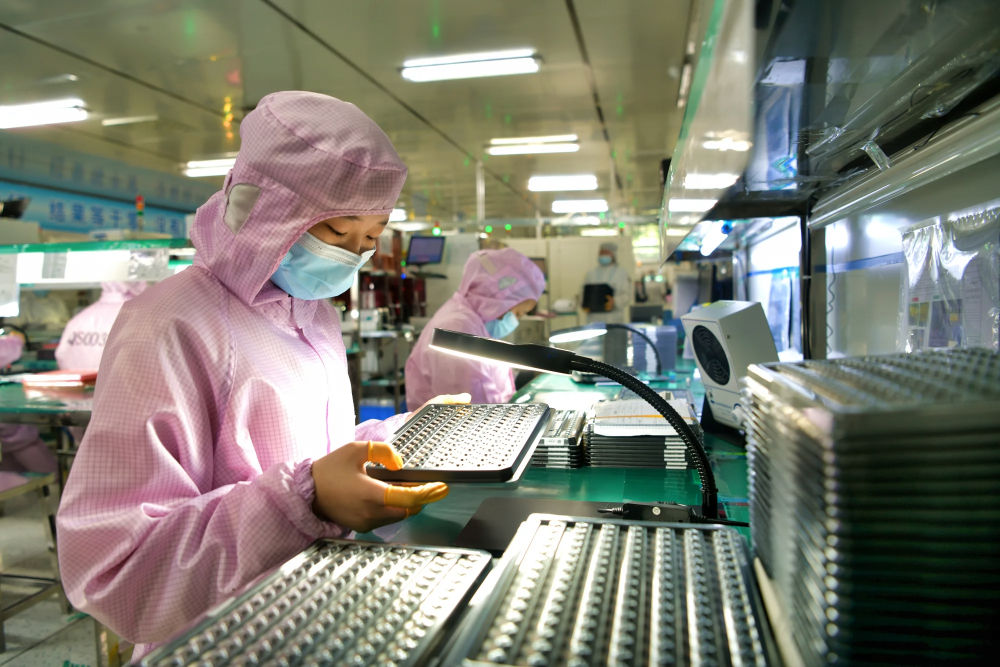 5月27日,在位于湖北省咸寧市通城縣的湖北三贏興光電科技股份有限公司無(wú)塵車間內(nèi),工人在生產(chǎn)準(zhǔn)備出口的智能攝像頭模組。新華社發(fā)(劉建平 攝)