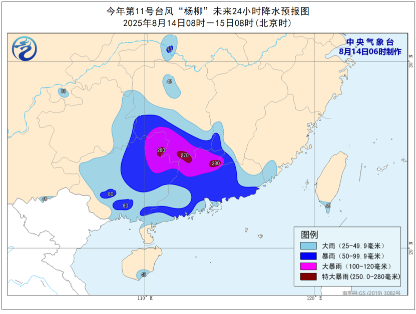 預(yù)計(jì),8月14日08時(shí)至15日08時(shí),廣東大部、廣西大部、福建東南部、江西南部、湖南中南部和西北部、貴州東部等地有大到暴雨,部分地區(qū)大暴雨,其中,廣東北部、廣西東北部、湖南南部、江西西南部等地局地有特大暴雨(250~280毫米)。上述部分地區(qū)伴有短時(shí)強(qiáng)降水(最大小時(shí)降雨量20~50毫米,局地可超過70毫米),局地有雷暴大風(fēng)等強(qiáng)對流天氣。
