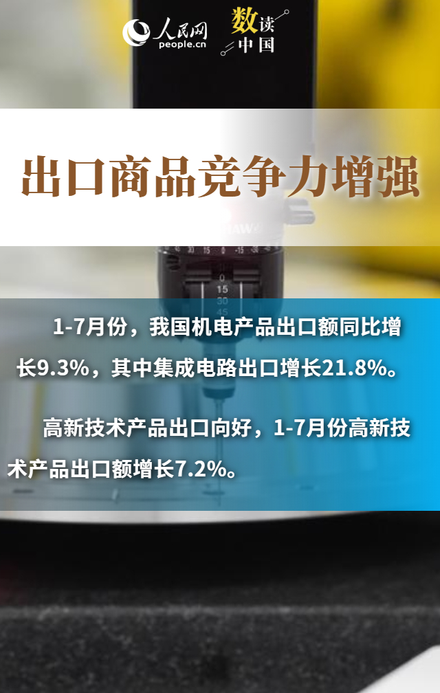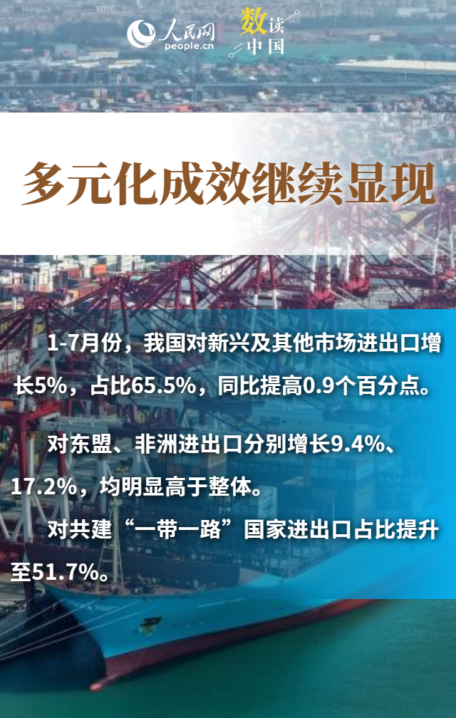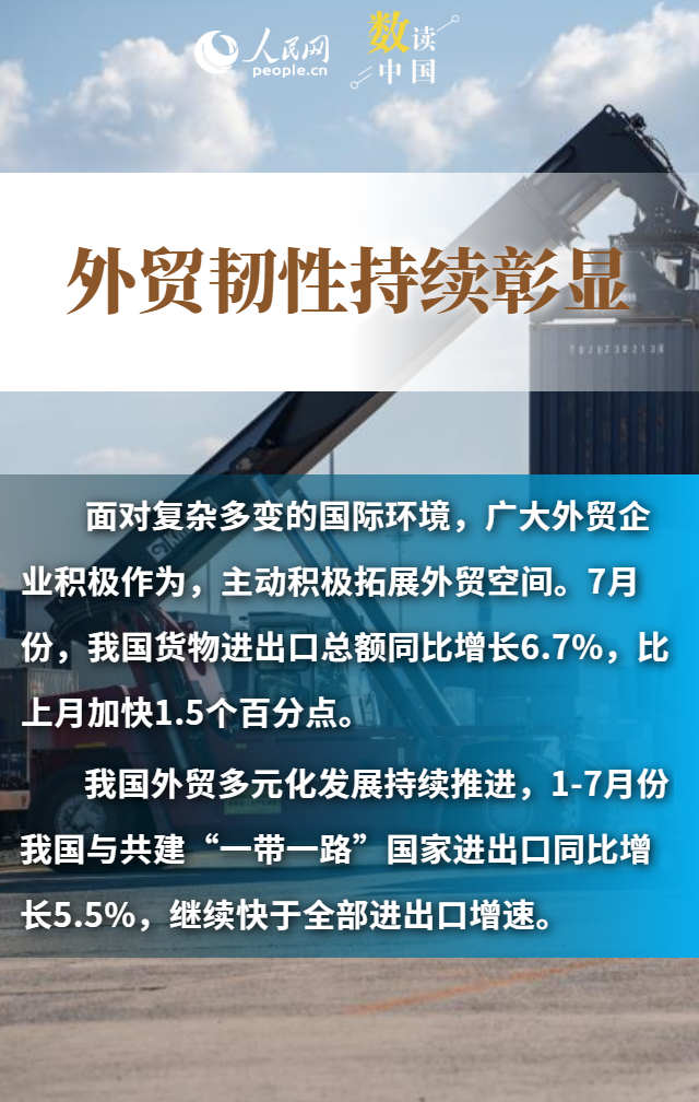 進出口規(guī)模創(chuàng)歷史新高、“朋友圈”不斷擴大、民營企業(yè)持續(xù)創(chuàng)新……數(shù)據(jù)顯示,今年前7個月,我國貨物貿(mào)易進出口總值25.7萬億元,同比增長3.5%。在外部挑戰(zhàn)之下,我國貨物進出口持續(xù)增長,展現(xiàn)出較強韌性和活力,為世界經(jīng)濟復蘇注入了中國力量。