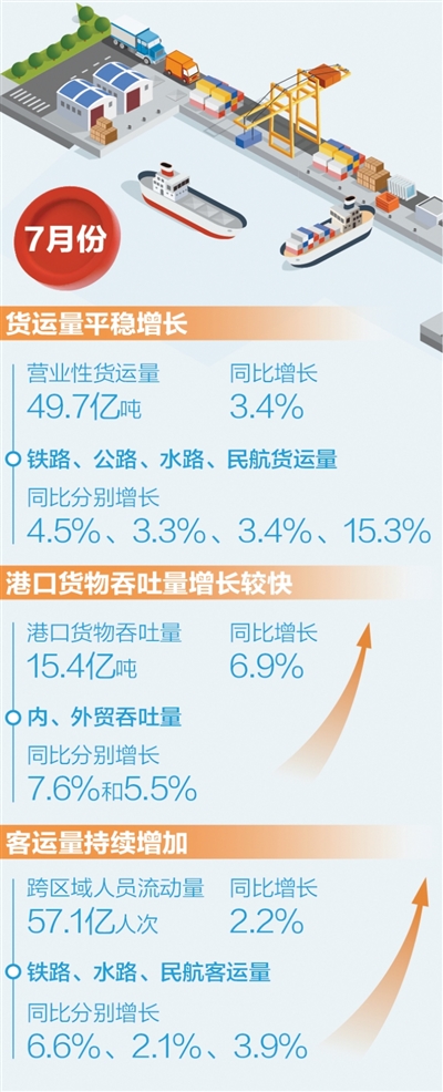 貨運(yùn)量保持平穩(wěn)增長。7月份,完成營業(yè)性貨運(yùn)量49.7億噸,同比增長3.4%,增速較上月回升0.5個(gè)百分點(diǎn)。分方式看,鐵路、公路、水路、民航貨運(yùn)量同比分別增長4.5%、3.3%、3.4%、15.3%。1至7月,完成營業(yè)性貨運(yùn)量330億噸,同比增長3.8%。