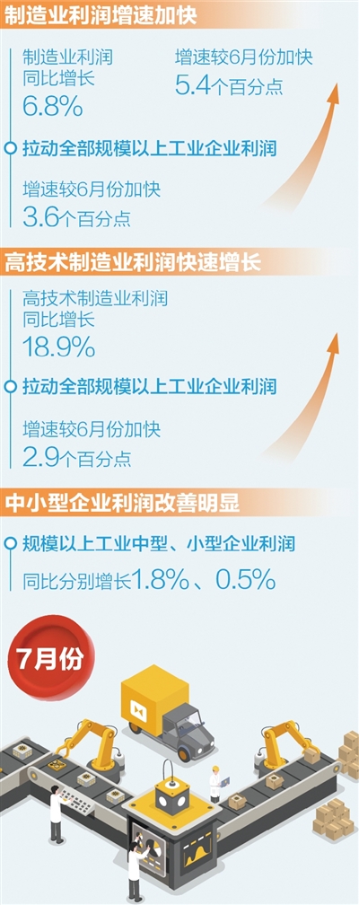 高技術(shù)制造業(yè)利潤快速增長,引領(lǐng)作用明顯。7月份,高技術(shù)制造業(yè)利潤由6月份下降0.9%轉(zhuǎn)為增長18.9%,拉動全部規(guī)模以上工業(yè)企業(yè)利潤增速較6月份加快2.9個(gè)百分點(diǎn),引領(lǐng)作用明顯。其中,航空航天器及設(shè)備制造行業(yè)利潤增長40.9%,生物藥品制造、化學(xué)藥品制劑制造等行業(yè)利潤分別增長36.3%、6.9%。