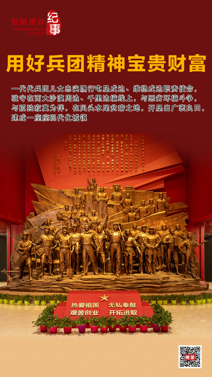 ◇2022年7月,習(xí)近平總書記在新疆考察時(shí)來到新疆生產(chǎn)建設(shè)兵團(tuán)八師石河子市,參觀新疆兵團(tuán)軍墾博物館。會見兵團(tuán)老中青三代建設(shè)者代表時(shí),他強(qiáng)調(diào),新疆生產(chǎn)建設(shè)兵團(tuán)為推動(dòng)新疆發(fā)展、增進(jìn)民族團(tuán)結(jié)、維護(hù)社會穩(wěn)定、鞏固國家邊防作出了不可磨滅的貢獻(xiàn)。兵團(tuán)人鑄就的熱愛祖國、無私奉獻(xiàn)、艱苦創(chuàng)業(yè)、開拓進(jìn)取的兵團(tuán)精神,是中國共產(chǎn)黨人精神譜系的重要組成部分,要用好這些寶貴財(cái)富。
