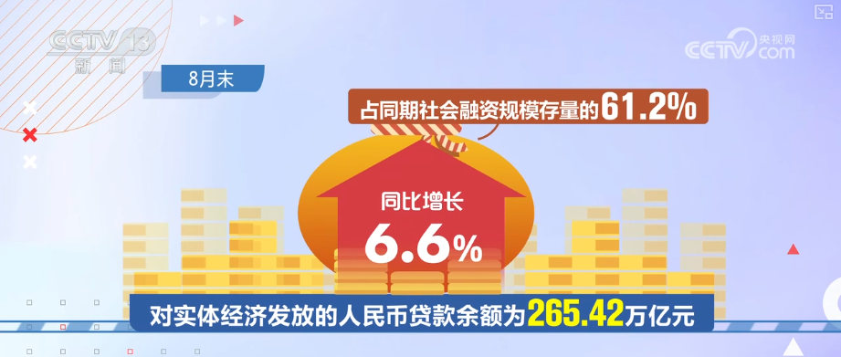 初步統(tǒng)計(jì),8月末,社會融資規(guī)模存量為433.66萬億元,同比增長8.8%。其中,對實(shí)體經(jīng)濟(jì)發(fā)放的人民幣貸款余額為265.42萬億元,同比增長6.6%,占同期社會融資規(guī)模存量的61.2%。