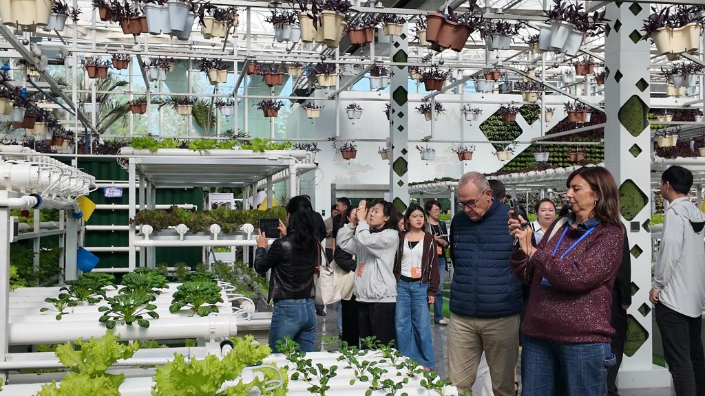 走進(jìn)昌吉新疆農(nóng)業(yè)博覽園內(nèi)的垂直農(nóng)業(yè)展示區(qū)、葉菜工廠示范區(qū)和果菜工廠示范區(qū),目睹無土栽培、無人機(jī)灌溉、光合作用智能調(diào)控等一系列農(nóng)業(yè)高科技應(yīng)用為作物“量身定制”生長環(huán)境,參訪議員們紛紛拍照記錄。